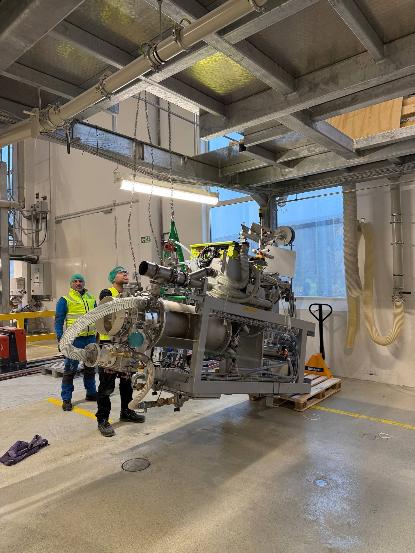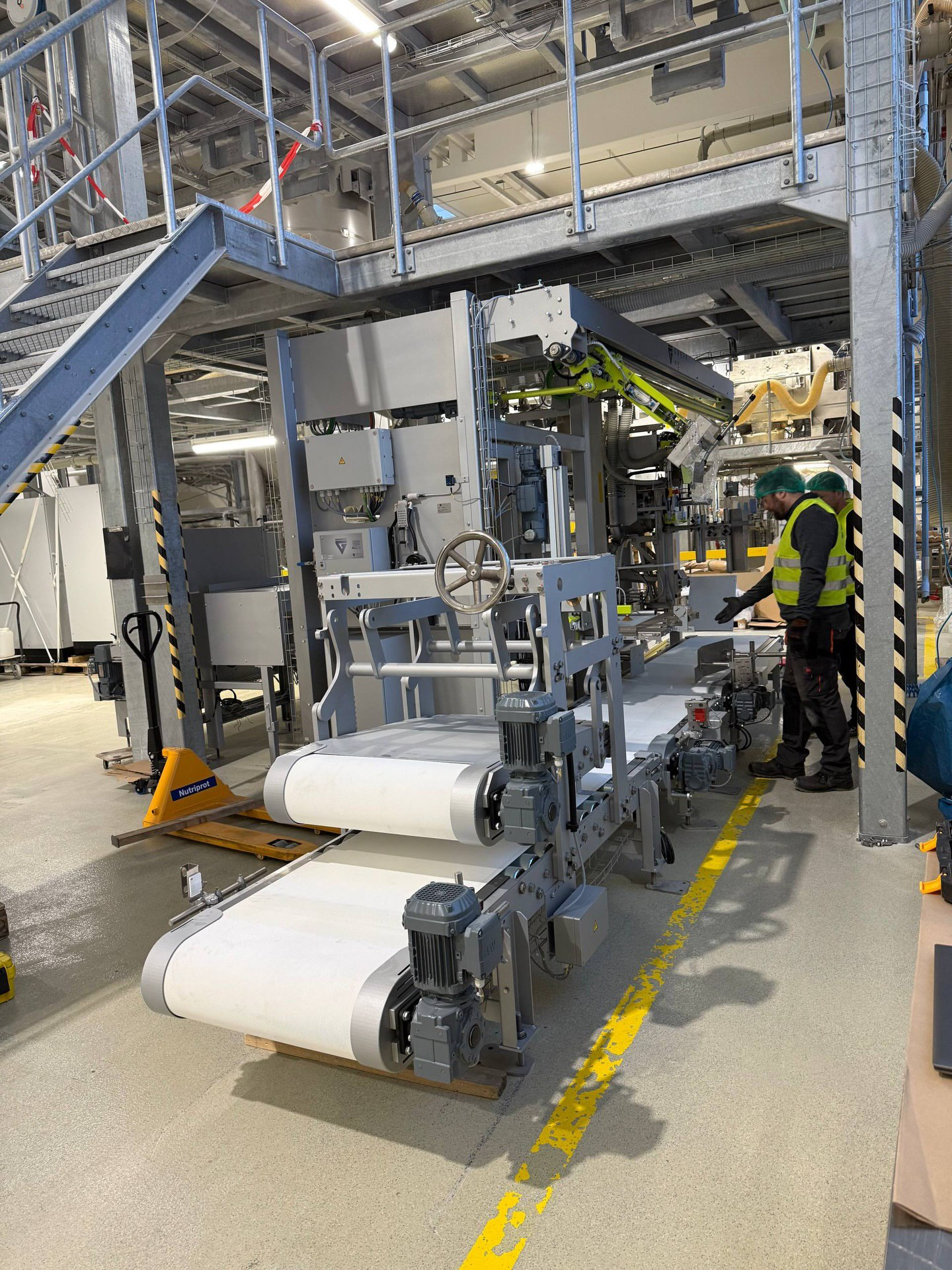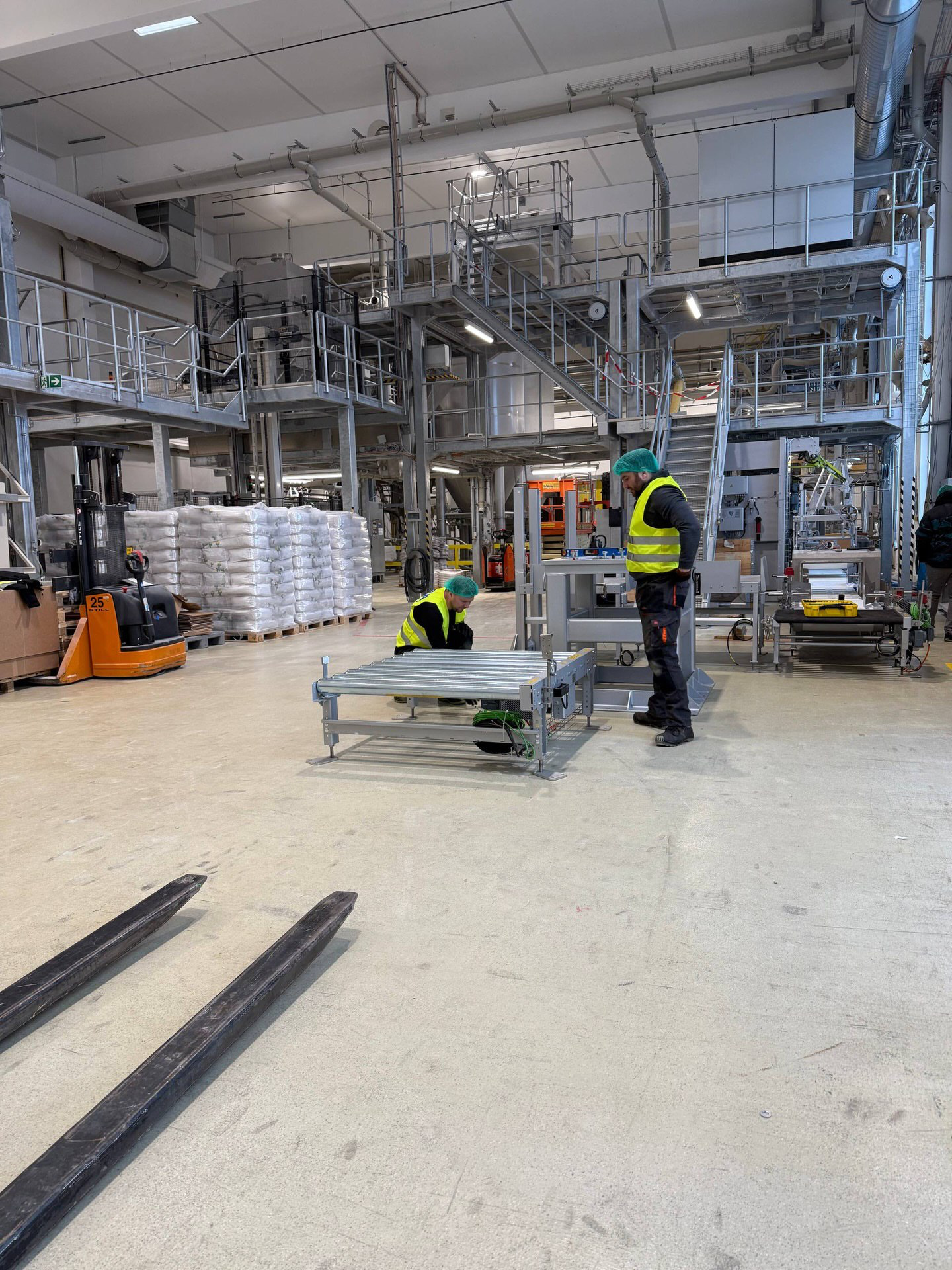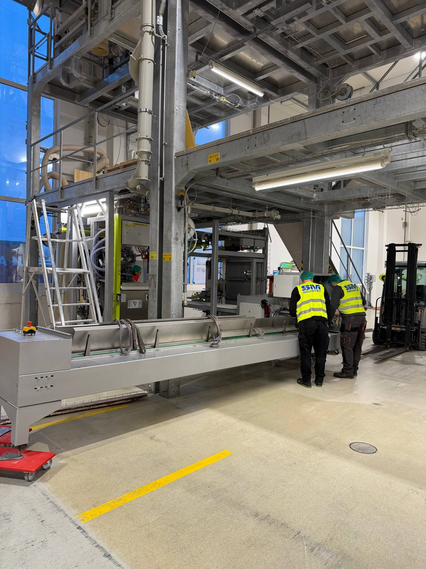 Kompleksowy montaż linii produkcyjnej do wytwarzania białka w Lubece, obejmujący integrację robota, montaż mechaniczny, precyzyjne poziomowanie oraz przygotowanie do uruchomienia w warunkach czynnego zakładu.