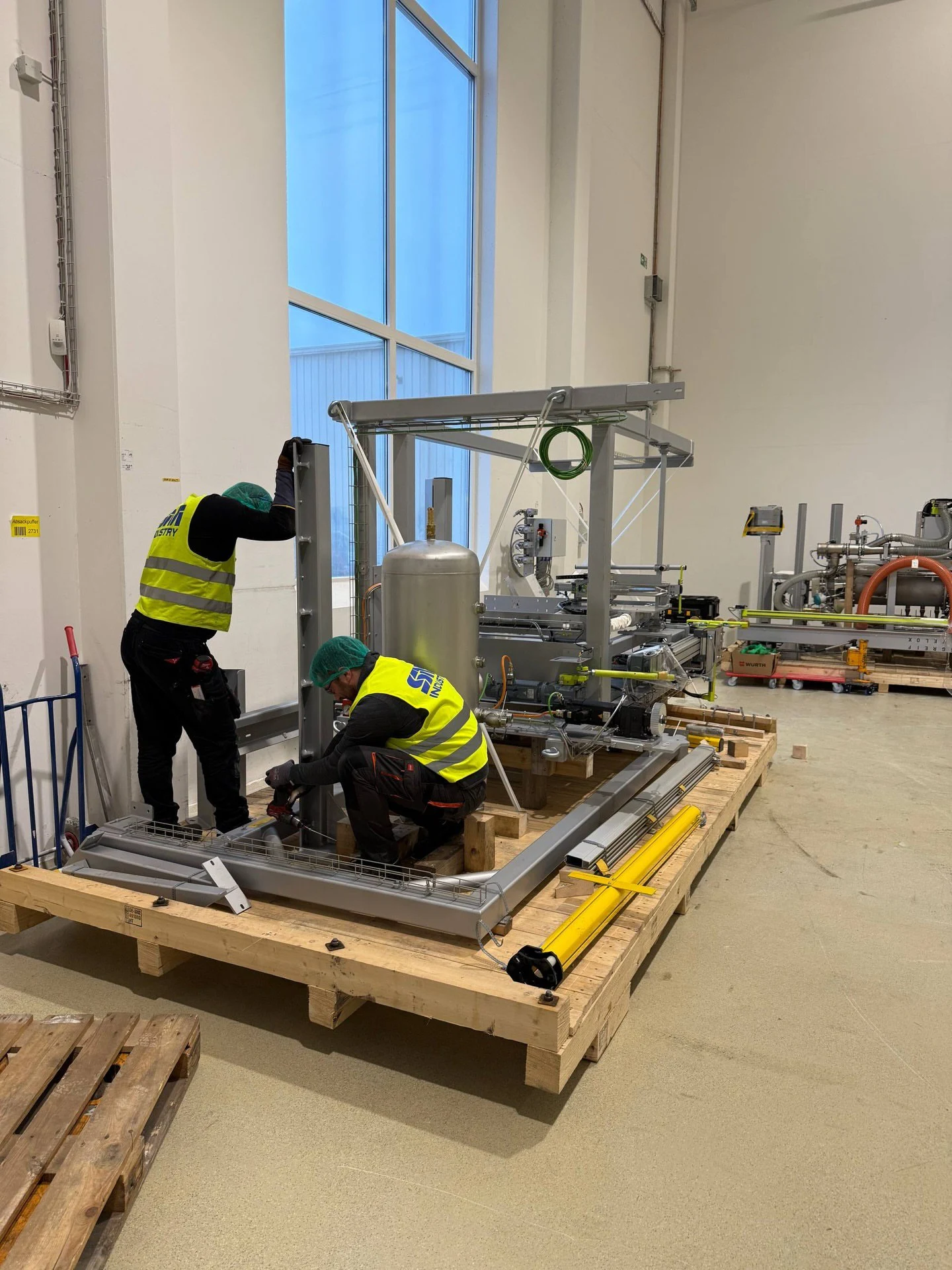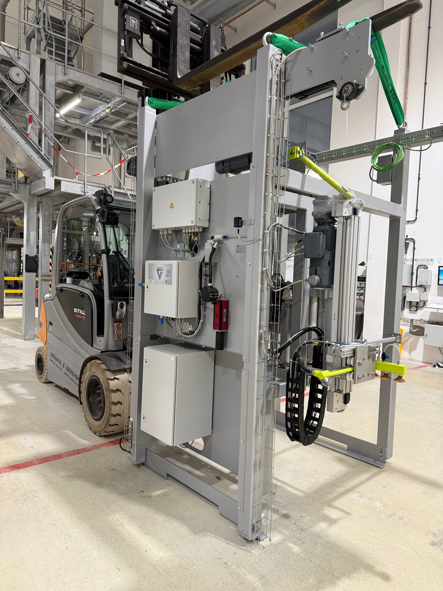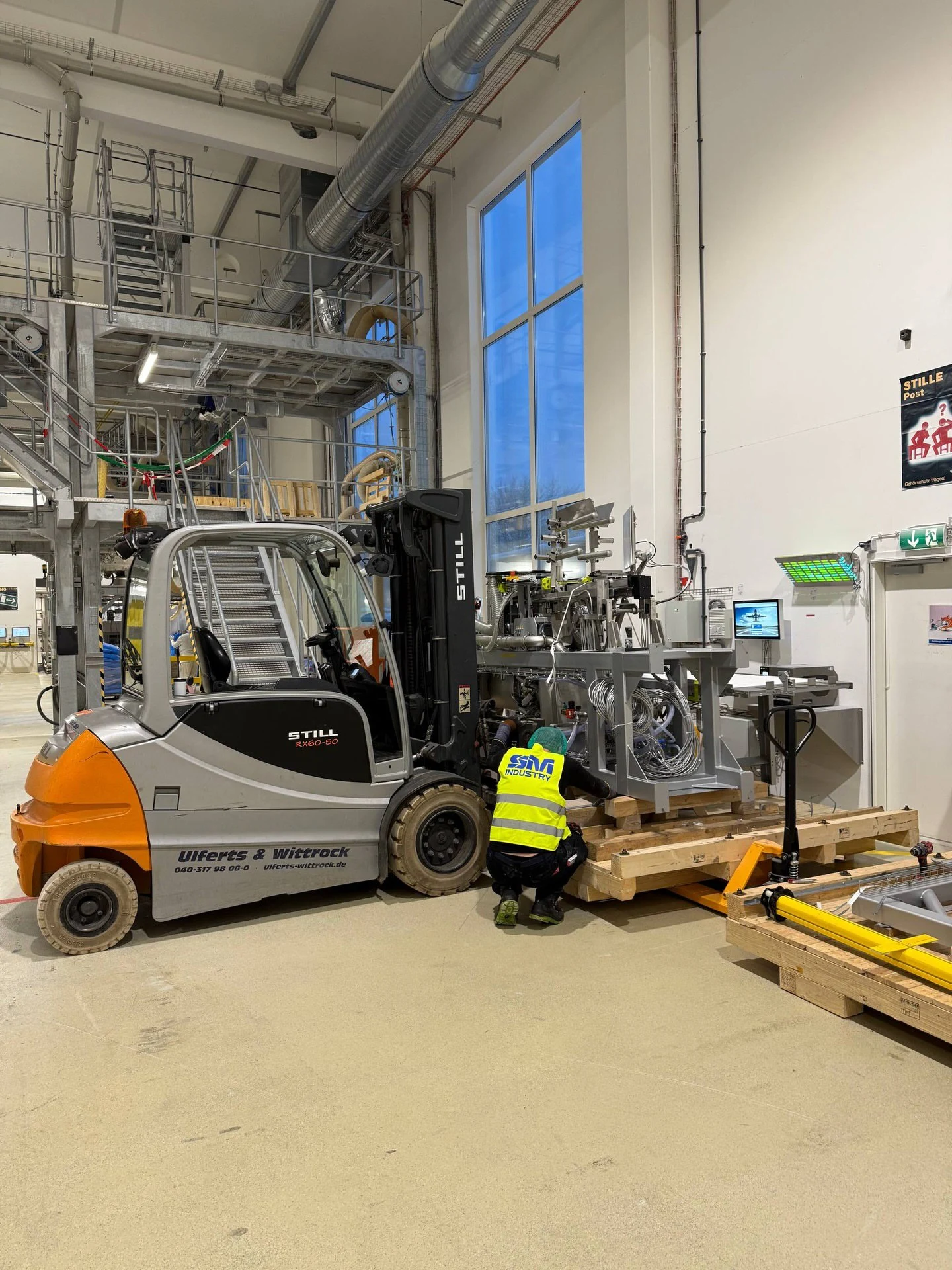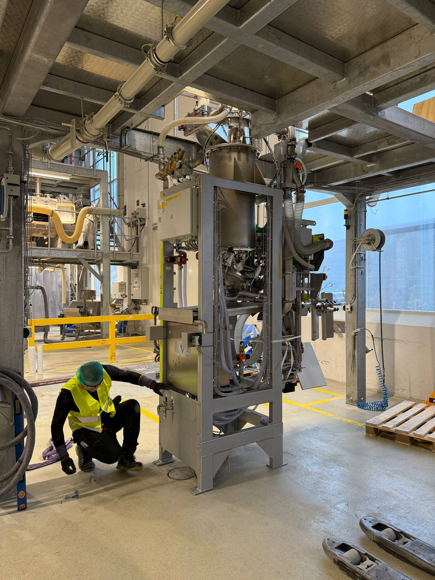 Kompleksowy montaż linii produkcyjnej do wytwarzania białka w Lubece, obejmujący integrację robota, montaż mechaniczny, precyzyjne poziomowanie oraz przygotowanie do uruchomienia w warunkach czynnego zakładu.